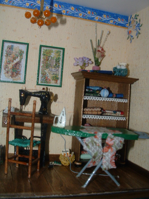 La table à repasser ainsi que le fer, sont en carton mousse sculpté au cutter puis peint avec de la peinture acrylique.